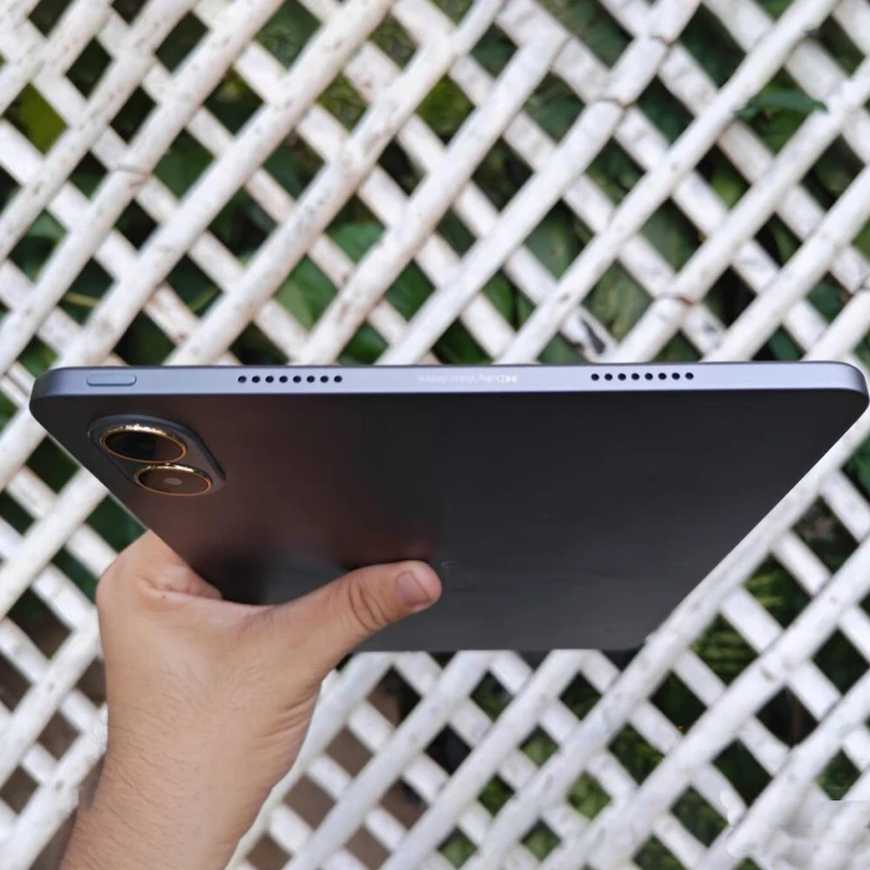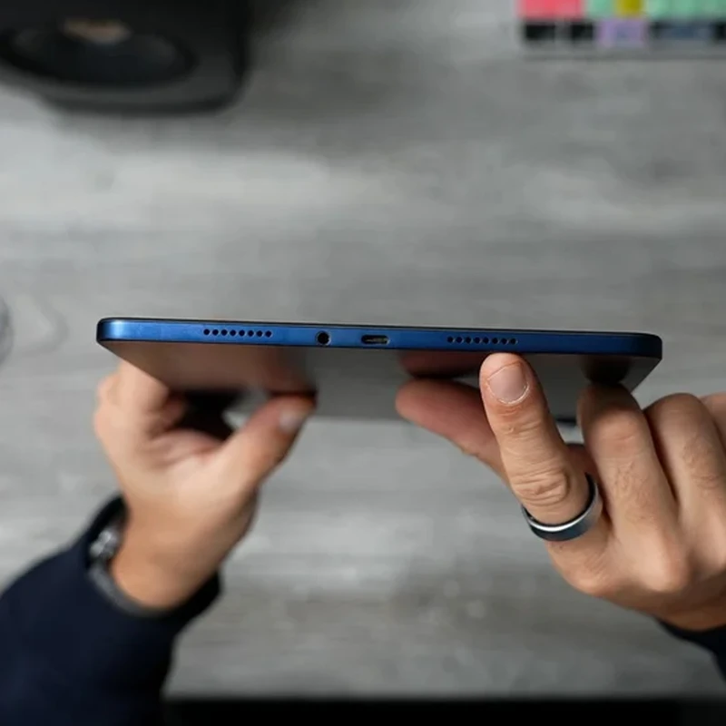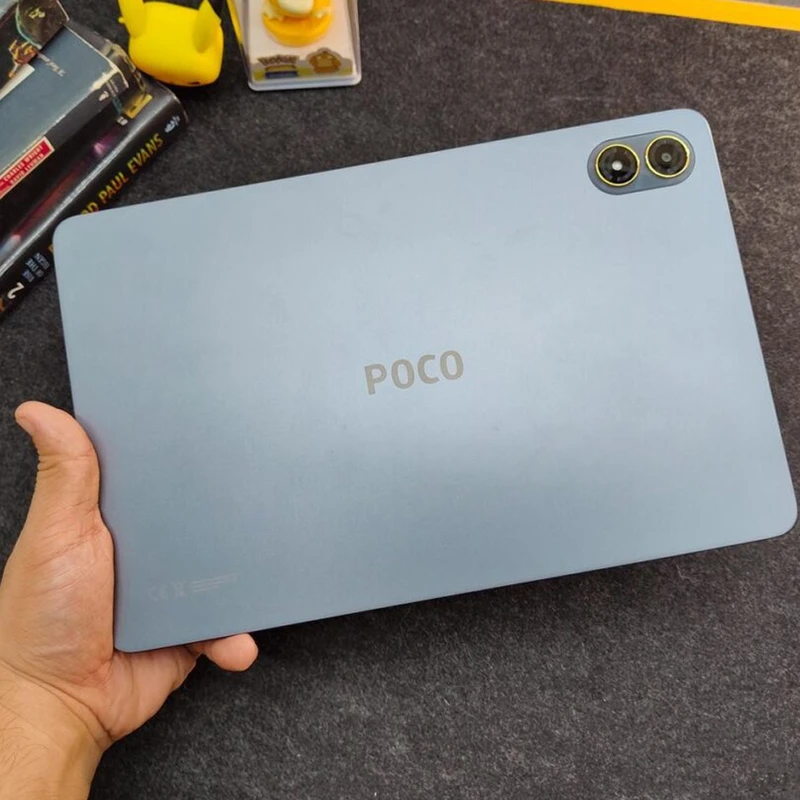 Poco Pad M1 با ابعاد ۲۷۹.۸x۱۸۱.۷x۷.۵ میلیمتر و وزن ۶۱۰ گرم در دسته تبلتهای بزرگ و سنگین قرار میگیرد، اما طراحی بدنه آلومینیومی با قاب جلو شیشهای باعث شده کیفیت ساخت دستگاه حس پریمیومتری نسبت به بسیاری از تبلتهای اقتصادی داشته باشد. ضخامت ۷.۵ میلیمتر برای تبلتی با باتری ۱۲۰۰۰ میلیآمپر ساعت کاملاً قابلقبول است و لبههای تخت در ترکیب با صفحهنمایش بزرگ، ظاهری مدرن و مینیمال ایجاد کردهاند. وزن ۶۱۰ گرم در استفاده طولانیمدت کمی محسوس است، اما با توجه به اندازه صفحه و باتری حجیم، امری طبیعی به نظر میرسد و هنگام استفاده روی میز یا با استند، مشکلی ایجاد نمیکند. پشتیبانی از قلم و کیبورد – هرچند کیبورد همراه ندارد – تبلت را به دستگاهی مناسب برای دانشجویان، تولیدکنندگان محتوا، طراحان معمولی و افرادی که یادداشتبرداری دیجیتال انجام میدهند تبدیل میکند. وجود جک ۳.۵ میلیمتری صدا نیز یک امتیاز مهم است، زیرا بسیاری از تبلتهای سال ۲۰۲۵ این درگاه را حذف کردهاند.