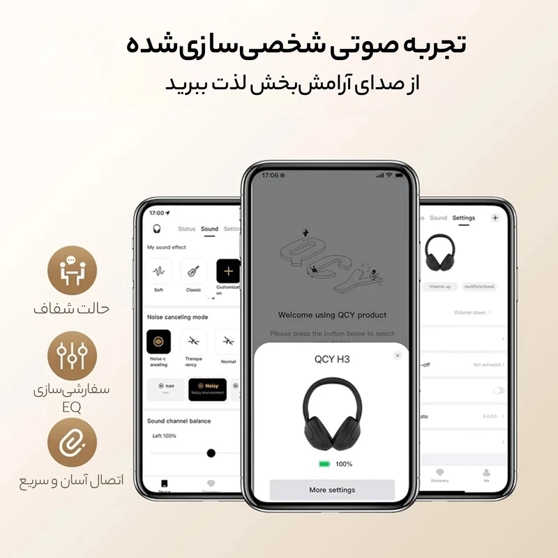 هدفون بلوتوثیQCY H3 یکی از محصولات جذاب بازار است که با طراحی حرفهای و امکانات پیشرفته، تجربهای فوقالعاده را برای کاربرانش فراهم میکند. این هدفون، چه از نظر کیفیت صدا و چه از نظر عملکرد کلی، عملکردی فراتر از انتظار ارائه میدهد. در ادامه نگاهی دقیقتر به ویژگیها و نقاط قوت و ضعف آن خواهیم داشت. از لحظهای که این هدفون را در دست میگیرید، طراحی ظریف و ارگونومیک آن جلب توجه میکند. با وزن ۲۶۳ گرم،QCY H3 برای استفاده طولانی مدت مناسب است و با تنظیم اندازه هد، برای هر کاربری احساس راحتی ایجاد میکند. بدنه پلاستیکی باکیفیت آن، در کنار رنگبندی مینیمال، هم مدرن است هم مستحکم و با دوام. در بخش صدا، هدفون بلوتوثیQCY مدل H3 با درایورهای ۴۰ میلیمتری عملکرد درخشانی دارد. صدای شفاف و عمیق، تجربه گوش دادن به موسیقی را لذتبخش میکند. فرقی نمیکند که موسیقی بیسدار گوش میدهید یا ترکهای کلاسیک؛ کیفیت صدا در همه حال متعادل و دلپذیر است. ویژگیLossless Audio باعث شده تا تمامی جزئیات موسیقی بدون ذرهای افت کیفیت، بازتولید شوند. فناوری حذف نویز فعال در این هدفون QCY یکی از بهترین قابلیتها است. در محیطهای شلوغ یا هنگام سفر، میتوانید با فعال کردن این ویژگی، از سر و صدای محیط دور شوید و فقط به موسیقی گوش دهید. همچنین، حالتTransparency به شما اجازه میدهد تا در صورت نیاز، صدای محیط را بشنوید، بدون اینکه هدفون را از روی گوش خود بردارید.